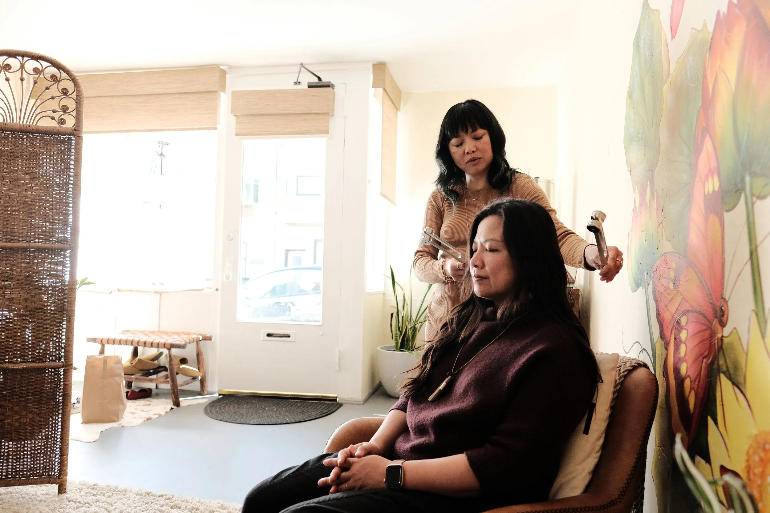 When you choose an in-person session at my office, in a quaint neighborhood in Nob Hill, near Chinatown in San Francisco, you may experience a sensory experience that includes visuals (sight), scents (smell), instruments and voice (sound), and a vibroacoustic sound table to lay on (sound and touch). For an online session, I may include sound and visuals on our Zoom call.